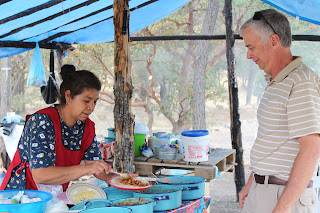 We stopped for lunch at one of the many makeshift roadside restaurants - the 'owners' sleep out in the fields at the side of the road with their children - the whole family with their sleeping bags and a makeshift shelter. The food was amazing. The lady that fed us was very friendly and suggested that Gerald take a photo of her handing me food. She opened each one of the cooking pots and explained to us what each contained and we even tried a new drink, previously unheard of to us, called Pinole. which is made from roasted corn (or the ancient grain pinole), ground into a flour and combined with water and some spices. She introduced us to her husband and children and we left there feeling very happy with ourselves because we had managed to hold a really good conversation in Spanish and eaten good food at the same time.