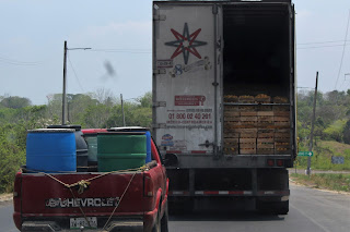 When you are selling or moving a truckload of mangos in the back of an open door truck, how do you stop them all rolling out? Necessity is the mother of invention and we are always seeing 'clever' solutions, thinking outside of the box in this country. In this case, stack a couple of sacks of mangos in the doorway to stop the loose ones rolling out.